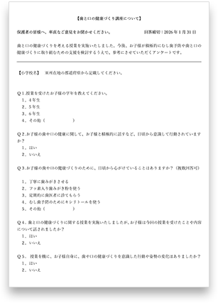 学校から配布された教材の中に用紙が入っております。回答後、お子様を通して学校の先生に提出をお願いいたします。可能であれば、冬休み前までに提出をお願いいたします。用紙はこちらからダウンロードも可能です。